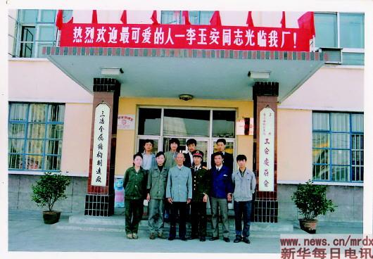 ▲這是李玉安生前到工廠作報告的照片(翻拍照片)。 新華社記者何山攝