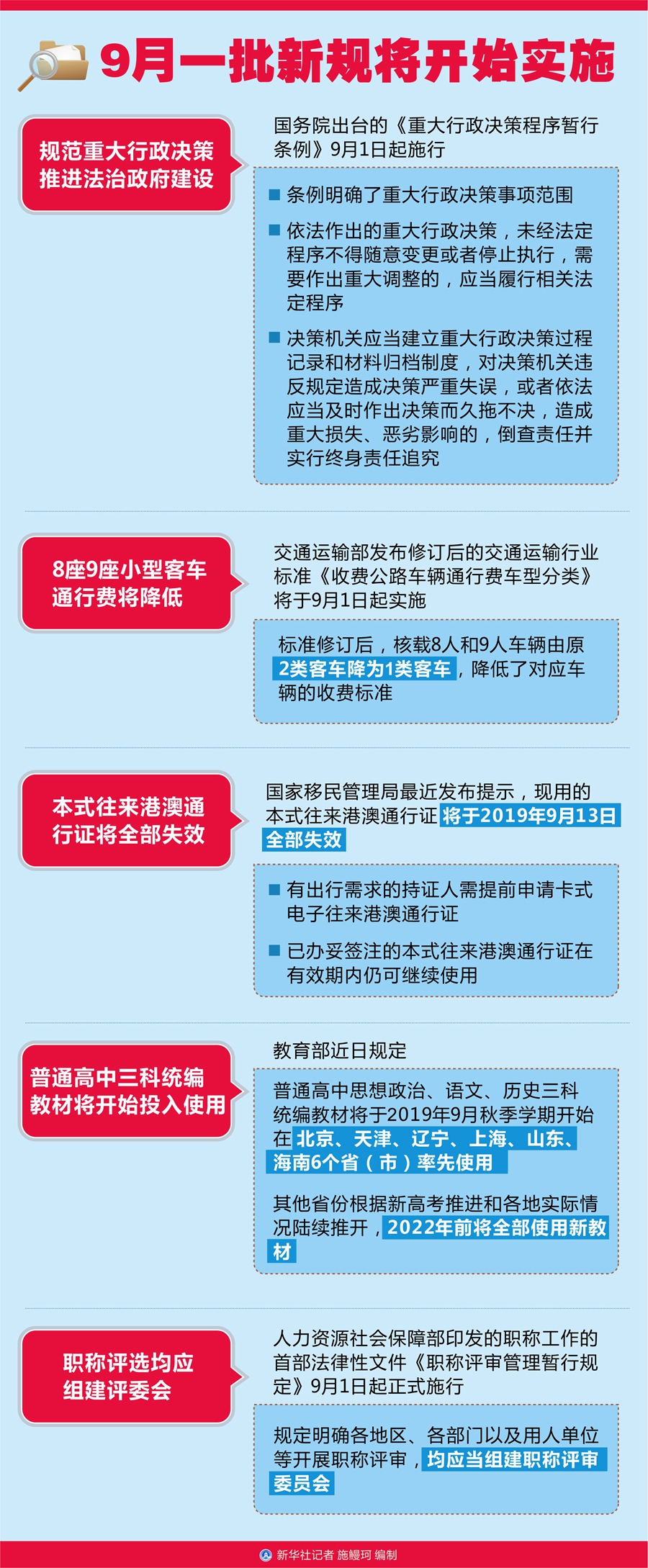 規(guī)范重大行政決策,推進(jìn)法治政府建設(shè);8座9座小型客車(chē)通行費(fèi)將降低;本式往來(lái)港澳通行證將全部失效;普通高中三科統(tǒng)編教材將開(kāi)始投入使用;職稱(chēng)評(píng)選均應(yīng)組建評(píng)委會(huì)……9月一批新規(guī)將開(kāi)始實(shí)施。