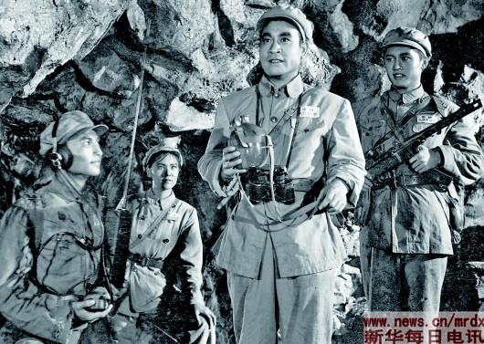 國(guó)產(chǎn)故事片《上甘嶺》鏡頭之一:堅(jiān)守在上甘嶺的英雄們——張連長(zhǎng)(右二)、通訊員楊德才(右一)、衛(wèi)生員王蘭(左二)。新華社發(fā)