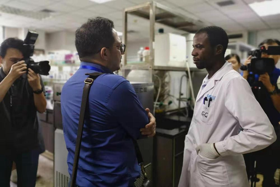 來自喀麥隆的阿諾德(右一)在病原微生物與免疫學重點實驗室從事博士后研究,他在向外國媒體記者介紹自己的工作。(王曉亮攝)