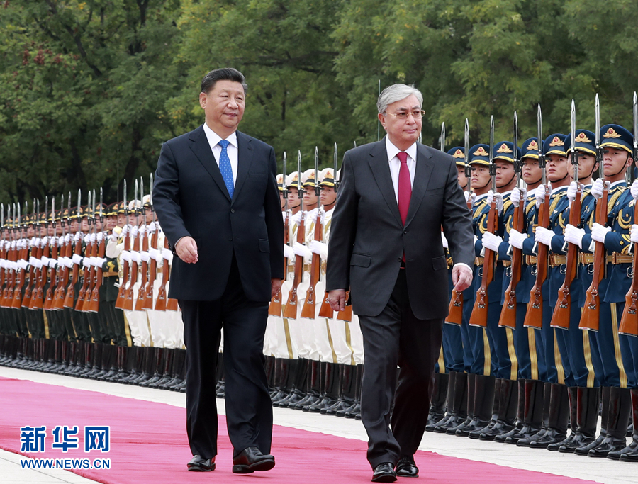 會談前,習近平在人民大會堂東門外廣場為托卡耶夫舉行歡迎儀式。楊潔篪、沈躍躍、王毅、夏寶龍、何立峰等參加。