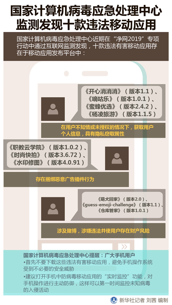 新華社天津9月15日電(記者張建新)國家計算機病毒應急處理中心近期在“凈網2019”專項行動中通過互聯網監測發現,十款違法有害移動應用存在于移動應用發布平臺中,其主要危害涉及隱私竊取、私自下載和賭博三類。這些違法有害移動應用具體如下: