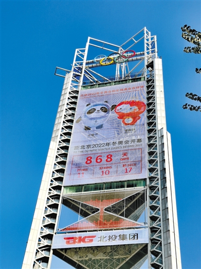 北京冬奧會倒計時裝置是近1000平方米的LED顯示屏,搭設(shè)在奧林匹克公園中心區(qū)核心位置的玲瓏塔上。