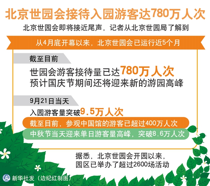 新華社北京9月23日電(魏夢佳、王雪純)北京世園會即將接近尾聲,記者從北京世園局了解到,從4月底開幕以來,北京世園會已運行近5個月,截至目前,世園會游客接待量已達780萬人次,預計國慶節期間還將迎來新的游園高峰。