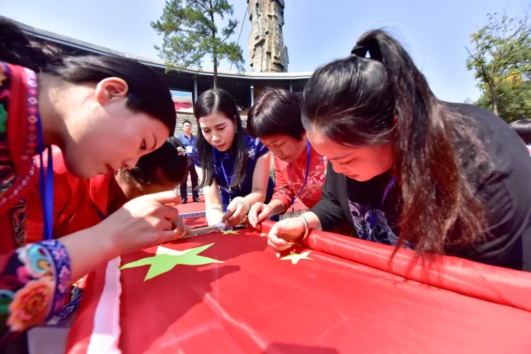 2019年9月28日,湖南張家界大峽谷景區。參加“壯麗七十年 繡出新時代”的武陵山(張家界)首屆刺繡大賽活動的評委們在比賽現場集體繡出一面鮮艷的五星紅旗。作者:歐小芳