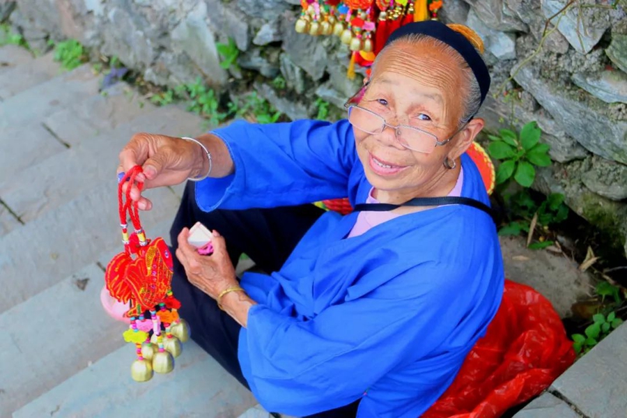 9月1日,廣西桂林。一位在景區(qū)編織五彩鈴的老奶奶。作者:zeus