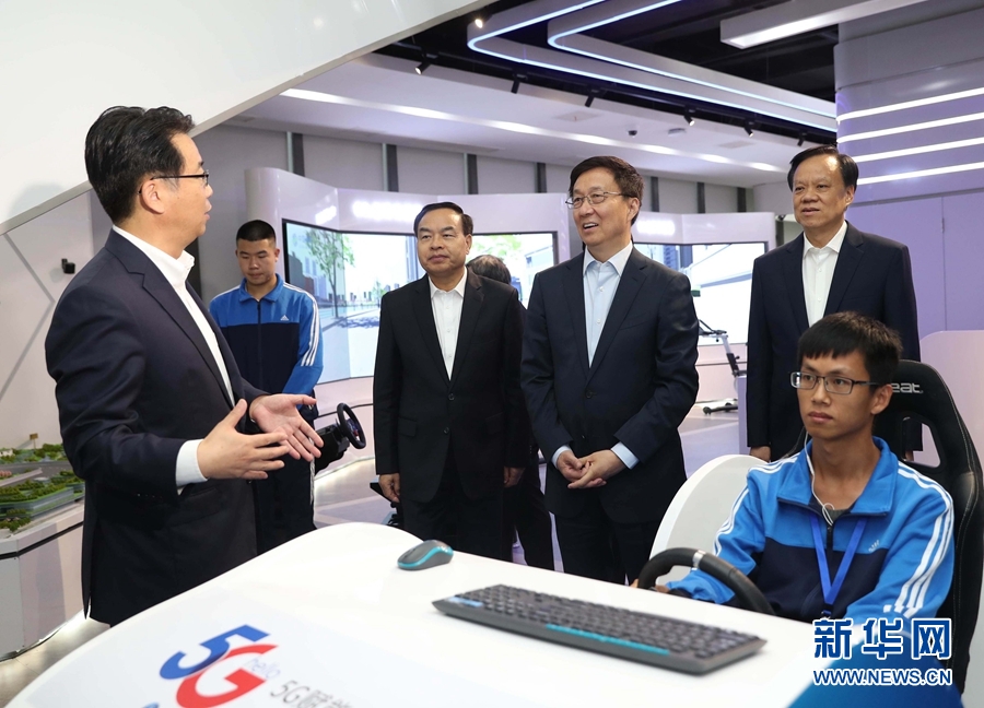 10月14日至15日,中共中央政治局常委、國務院副總理韓正在重慶市調研。這是10月15日,韓正來到禮嘉智慧公園,了解園區開發建設情況,體驗智能機器人和5G技術在遠程駕駛、教育、旅游等方面的應用。 新華社記者 劉衛兵 攝