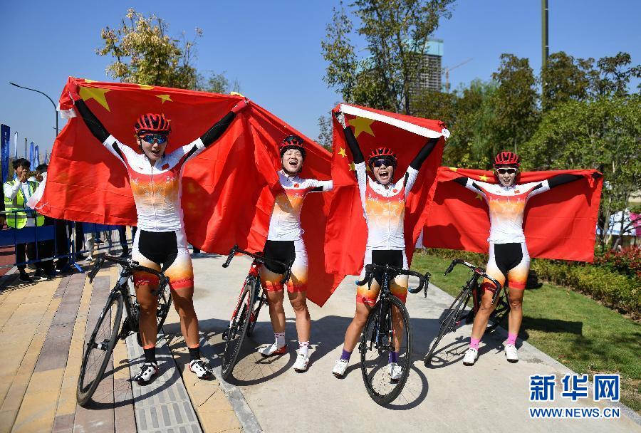 ??? 10月20日,中國隊選手趙茜沙、普譯嫻、梁洪玉和孫佳君(從右至左)慶祝奪冠。 當日,在武漢舉行的第七屆世界軍人運動會公路自行車女子公路團體決賽中,中國隊以4小時05分46秒的成績獲得金牌。 新華社記者李尕攝