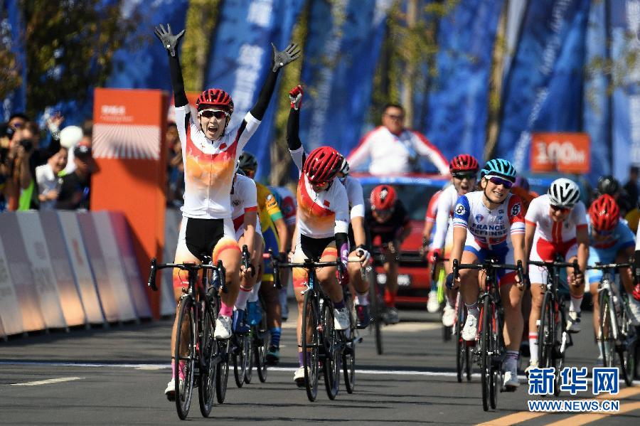10月20日,中國隊選手趙茜沙(左)沖過終點后慶祝。 當日,在武漢舉行的第七屆世界軍人運動會公路自行車女子公路個人決賽中,中國隊選手趙茜沙以2小時02分53秒的成績獲得冠軍。 新華社記者李尕攝