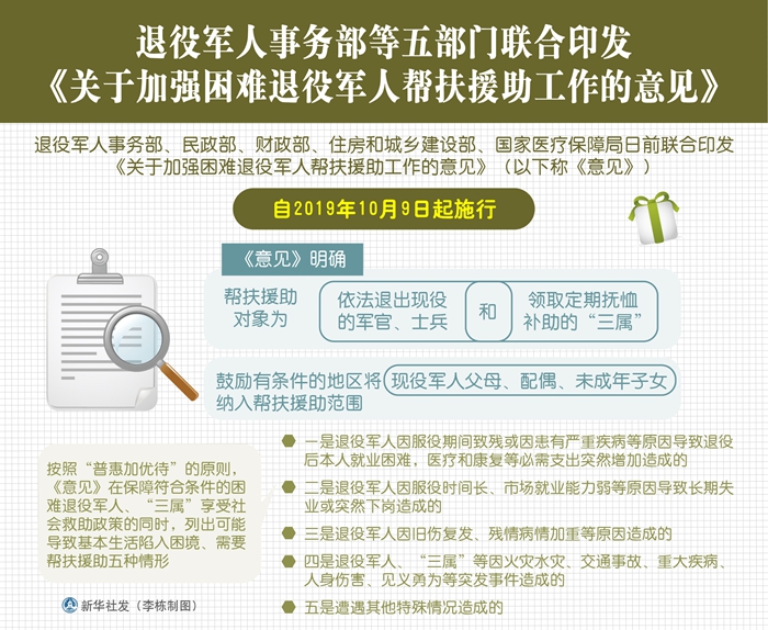 新華社北京10月21日電(記者梅世雄)退役軍人事務部、民政部、財政部、住房和城鄉建設部、國家醫療保障局日前聯合印發《關于加強困難退役軍人幫扶援助工作的意見》(以下稱《意見》),自2019年10月9日起施行。