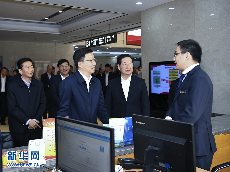 10月21日至22日,中共中央政治局常委、國務院副總理韓正在山西省調研。這是10月21日,韓正來到山西省政務服務中心,考察政府職能轉變和“放管服”改革推進情況。 新華社記者 燕雁 攝
