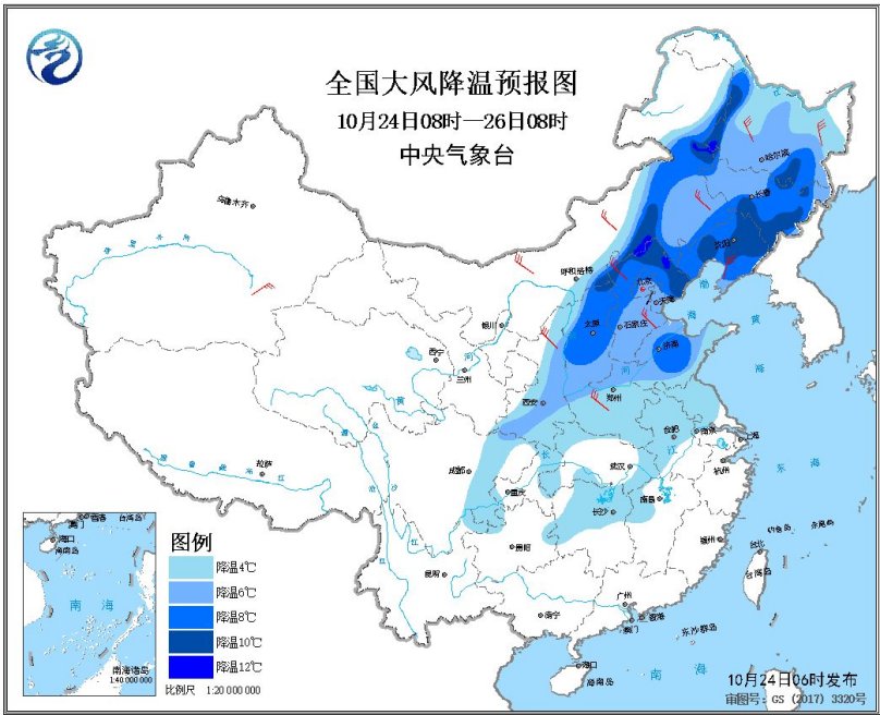而今天起,冷空氣將會繼續南下逐步影響中東部地區,中央氣象臺預計,10月24日08時至26日08時,西北地區東部、東北大部、華北、黃淮、江淮、四川盆地、湖北西部和東部、湖南北部、江西西北部等地的部分地區氣溫將下降4~8℃,其中內蒙古中部偏東和東北部、東北地區東南部等地的部分地區降溫可達10℃以上,并伴有4~6級偏北風、陣風7~8級。