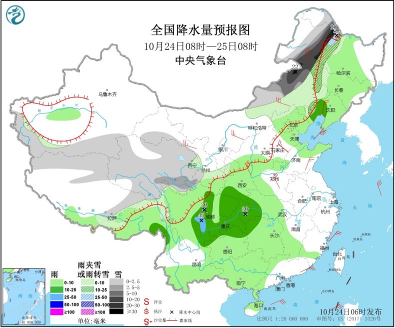 冷空氣不僅制造降溫,今明兩天還會給東北、華北等地制造雨雪天氣,同時華西地區的陰雨也將延綿不絕。中央氣象臺預計,10月24日08時至25日08時,黑龍江西部、內蒙古中東部、甘肅南部、青海、西藏東部等地的部分地區有小到中雪或雨夾雪,其中內蒙古中部偏北和東北部、黑龍江西北部等地有大雪,局地暴雪或大暴雪;遼寧西南部、西南地區東部、湖北西南部、湖南西北部等地的部分地區有中雨,局地大雨(25~45毫米)。