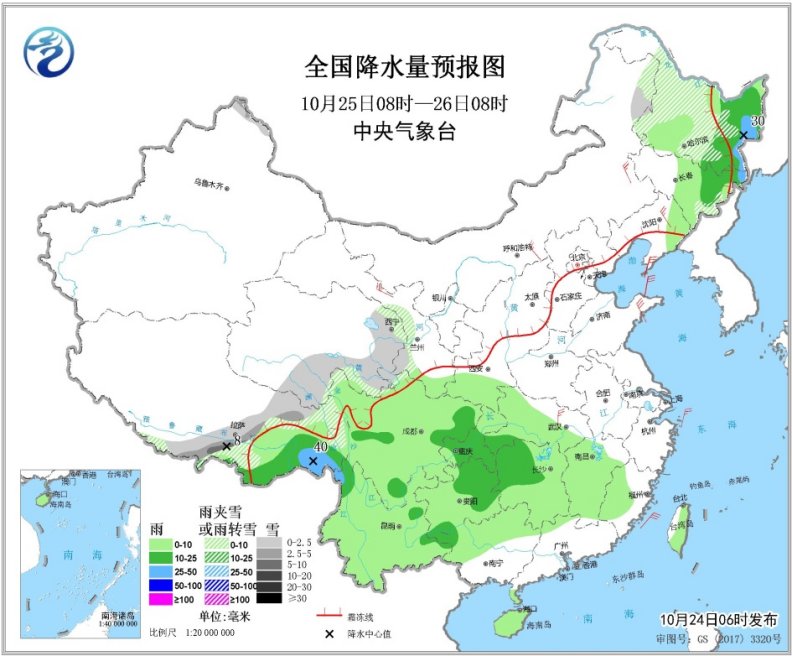 10月25日08時至26日08時,內蒙古東北部、黑龍江中部、西藏東北部和南部、青海東部和南部、甘肅河西等地的部分地區有小到中雪或雨夾雪,其中西藏南部局地有大雪。東北地區東部、西藏東南部、四川盆地中東部、湖南西部、貴州等地的部分地區有中雨,局地有大雨(25~40毫米)。