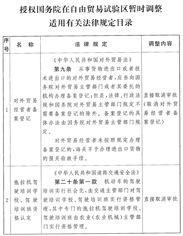全國人民代表大會常務委員會關于授權國務院在自由貿(mào)易試驗區(qū)暫時調(diào)整適用有關法律規(guī)定的決定