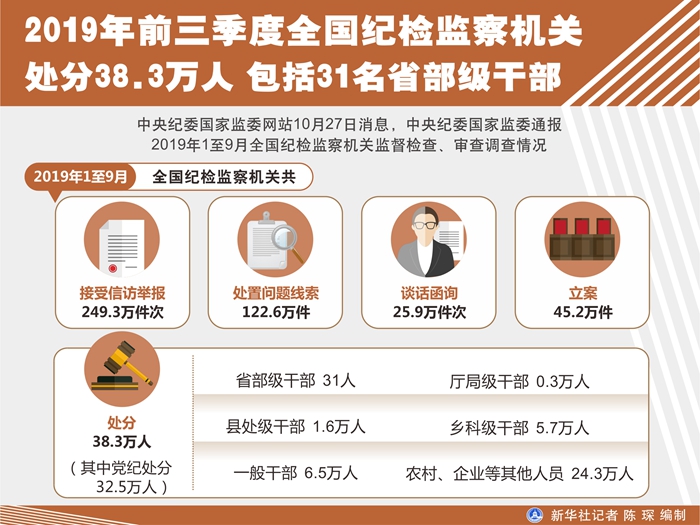 通報顯示,2019年1至9月,全國紀檢監察機關共接受信訪舉報249.3萬件次,處置問題線索122.6萬件,談話函詢25.9萬件次,立案45.2萬件,處分38.3萬人(其中黨紀處分32.5萬人)。處分省部級干部31人,廳局級干部0.3萬人,縣處級干部1.6萬人,鄉科級干部5.7萬人,一般干部6.5萬人,農村、企業等其他人員24.3萬人。