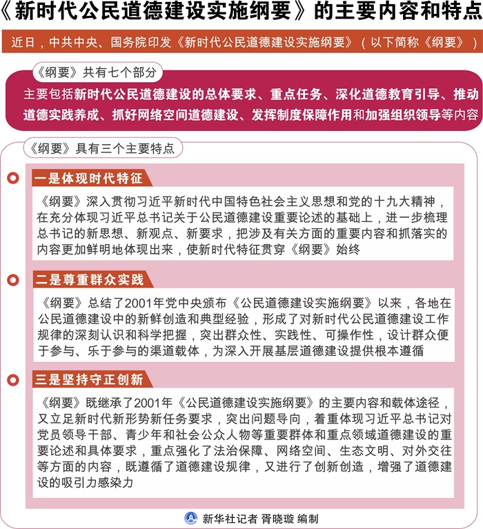 《綱要》具有三個主要特點:一是體現時代特征。《綱要》深入貫徹習近平新時代中國特色社會主義思想和黨的十九大精神,在充分體現習近平總書記關于公民道德建設重要論述的基礎上,進一步梳理總書記的新思想、新觀點、新要求,把涉及有關方面的重要內容和抓落實的內容更加鮮明地體現出來,使新時代特征貫穿《綱要》始終。二是尊重群眾實踐。《綱要》總結了2001年黨中央頒布《公民道德建設實施綱要》以來,各地在公民道德建設中的新鮮創造和典型經驗,形成了對新時代公民道德建設工作規律的深刻認識和科學把握,突出群眾性、實踐性、可操作性,設計群眾便于參與、樂于參與的渠道載體,為深入開展基層道德建設提供根本遵循。三是堅持守正創新。《綱要》既繼承了2001年《公民道德建設實施綱要》的主要內容和載體途徑,又立足新時代新形勢新任務要求,突出問題導向,著重體現習近平總書記對黨員領導干部、青少年和社會公眾人物等重要群體和重點領域道德建設的重要論述和具體要求,重點強化了法治保障、網絡空間、生態文明、對外交往等方面的內容,既遵循了道德建設規律,又進行了創新創造,增強了道德建設的吸引力感染力。