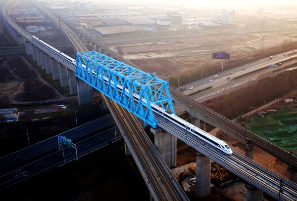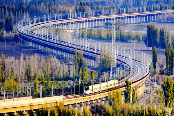 蘭新高鐵動(dòng)車組列車在新疆哈密特大橋上行駛 (蔡增樂 攝)