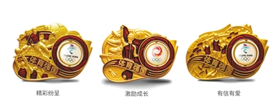 “精彩紛呈”徽章的畫面選取中國足球聯賽和中國職業籃球聯賽畫面,象征著中國職業體育的發展歷程。中國體育產業正在快速發展,成為經濟增長新動能。“激勵成長”徽章主畫面選取奧運金牌選手揮舞國旗、身穿品牌“戰衣”的奪冠經典瞬間,各種體育裝備、器材環繞四周,體現出中國優秀的體育企業與體育品牌經過了數十年發展歷程。“有信有愛”徽章的主畫面中,三名青年迎著朝陽奔跑,身后一張張飄揚的體育彩票匯成旗幟,徽章下方金色雙手托起陽光,呈現出一幅“有信有愛,樂善人生”的畫面。