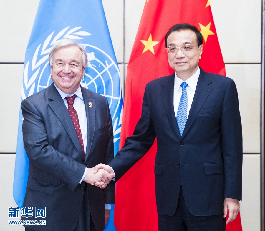 11月3日,國(guó)務(wù)院總理李克強(qiáng)在曼谷會(huì)見(jiàn)聯(lián)合國(guó)秘書(shū)長(zhǎng)古特雷斯。 新華社記者 黃敬文 攝