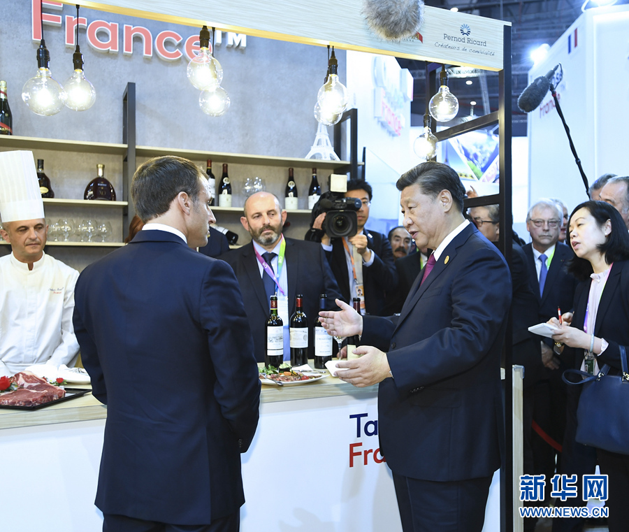 習近平在法國總統馬克龍陪同下首先來到法國館。馬克龍熱情邀請習近平品嘗法國紅酒和牛肉食品。在場法國企業家爭先恐后向習近平表示,法國企業看好中國市場,希望進一步擴大對華出口。習近平指出,中國消費市場很大,可以滿足不同層次的多樣化需求,希望法國企業家展現長遠眼光,同中國加強互利合作。