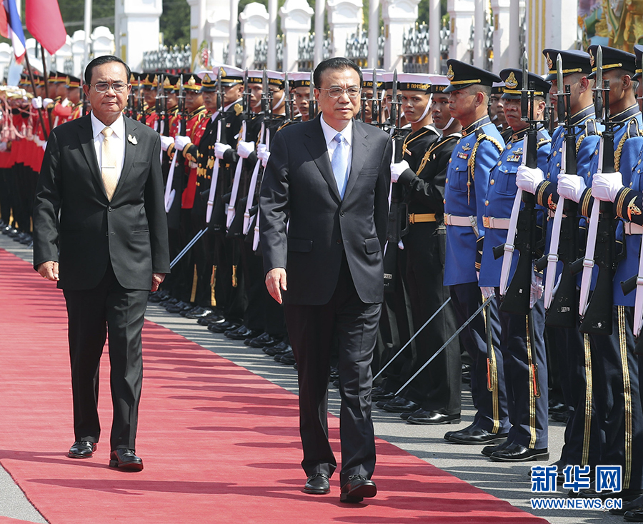 會談前,巴育在總理府前廣場為李克強舉行隆重歡迎儀式。兩國總理登上檢閱臺,軍樂隊高奏中泰兩國國歌。李克強在巴育陪同下檢閱了儀仗隊。