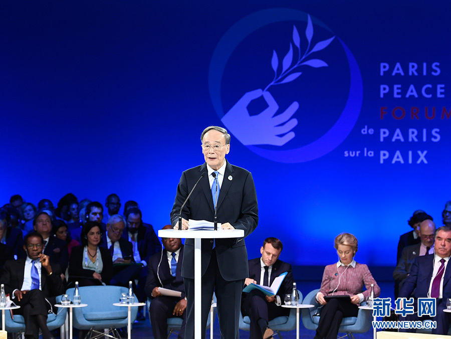 11月12日,國(guó)家副主席王岐山在法國(guó)巴黎出席第二屆巴黎和平論壇開幕式并致辭。 新華社記者 申宏 攝
