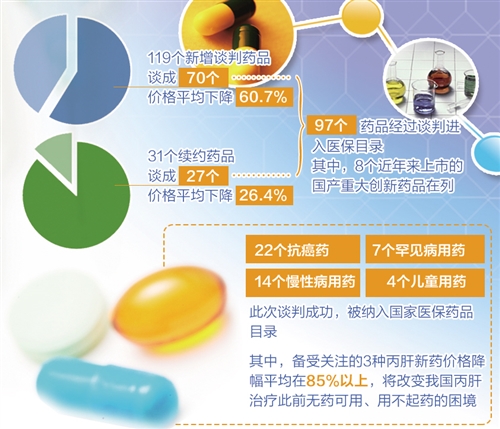 記者了解到,22個抗癌藥、7個罕見病用藥、14個慢性病用藥、4個兒童用藥此次談判成功,被納入國家醫保藥品目錄。其中,備受關注的3種丙肝新藥價格降幅平均在85%以上,將改變我國丙肝治療此前無藥可用、用不起藥的困境。