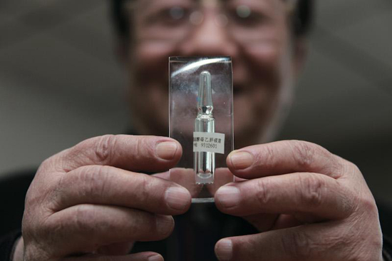 趙鎧院士手持基因工程乙肝疫苗樣品。默沙東官網