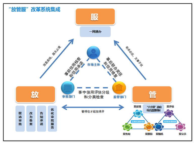 注重系統(tǒng)集成,突出協(xié)同高效。“大道至簡,實干為要。”回顧上海市浦東新區(qū)“證照分離”改革歷程,始終堅持以“減證”促“簡政”,在行政審批上做“減法”,把“放手”當作最大的“抓手”,同時加強事中事后監(jiān)管,堅持“放手”但不“甩手”,持續(xù)推進政府職能深刻轉變。在“放”的方面,著重體現“一個轉變、兩個確立”:一個轉變即轉變審批管理模式,從重事前準入審核轉為重事中事后監(jiān)管;兩個確立即確立清單管理制度,將涉企經營許可事項全部納入清單管理,清單之外,企業(yè)取得營業(yè)執(zhí)照即可自主開展經營;確立“四扇門”改革方式,取消審批的注重協(xié)同配套,改為備案的注重當場辦結,告知承諾的注重信用支撐,優(yōu)化審批服務的注重簡便透明。在“管”的方面,探索確立了“雙告知、雙反饋、雙跟蹤、雙隨機、雙評估、雙公示”的“六個雙”政府全程閉環(huán)綜合監(jiān)管新模式。在“服”的方面,強化“互聯網+政務服務”融合創(chuàng)新,推動政府管理創(chuàng)新與信息技術深度融合,依托“一網通辦”推進政務服務扁平化、便捷化、智能化,讓數據多跑路、群眾少跑腿。(見下圖)