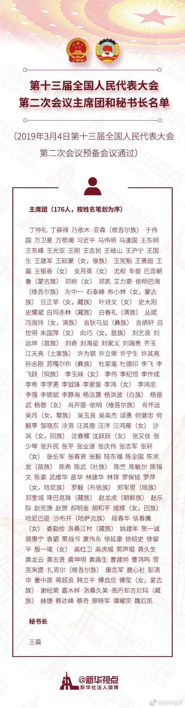 第十三屆全國人民代表大會第二次會議主席團和秘書長名單