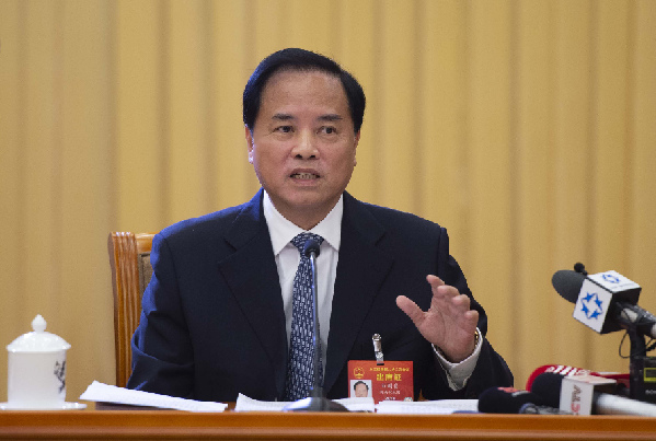 3月5日,海南代表團在住地召開全體會議,審議政府工作報告。圖為劉賜貴代表審議時發言。新華網發(王凱 攝)