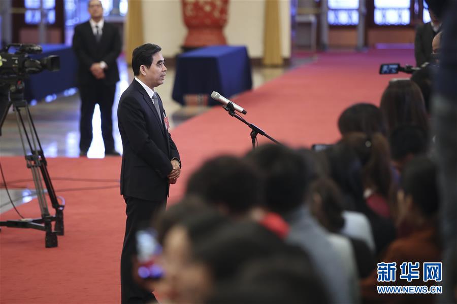 3月12日,十三屆全國人大二次會議在北京人民大會堂舉行第三次全體會議。這是人力資源和社會保障部部長張紀南在“部長通道”接受采訪。 新華社記者 金立旺 攝