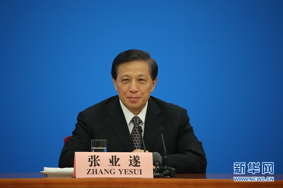 3月15日上午十三屆全國人大二次會議閉幕后,國務院總理李克強在人民大會堂三樓金色大廳會見采訪十三屆全國人大二次會議的中外記者并回答記者提出的問題。圖為大會發言人張業遂。新華網/中國政府網 劉廈 攝?