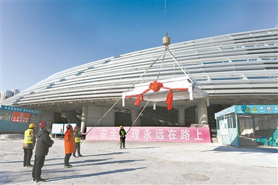 2019年12月31日,施工人員在國家速滑館施工現(xiàn)場起吊最后一塊待安裝的屋面單元板塊。項目建設(shè)方有關(guān)負責人表示,國家速滑館“冰絲帶”能如期實現(xiàn)“絲帶飛舞”,離不開強有力的監(jiān)督。新華社記者 鞠煥宗 攝