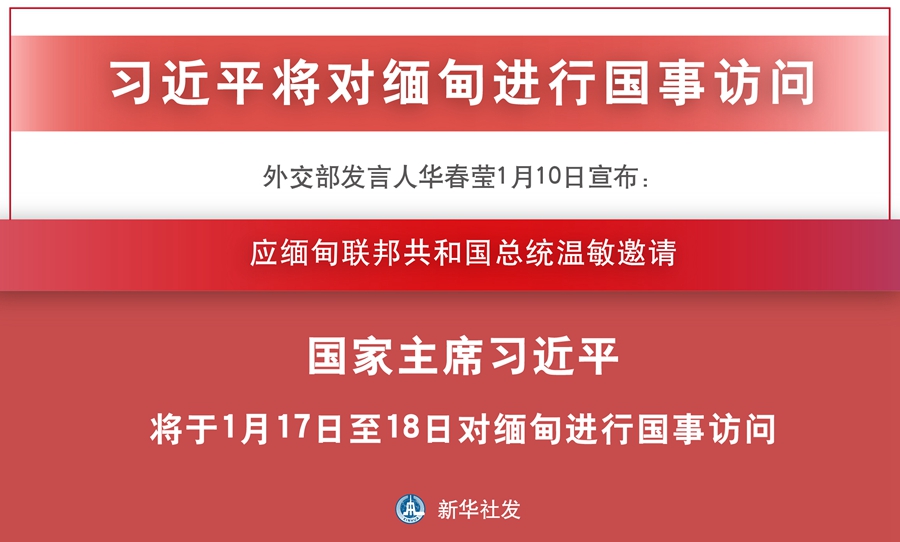 新華社北京1月10日電 外交部發言人華春瑩10日宣布:應緬甸聯邦共和國總統溫敏邀請,國家主席習近平將于1月17日至18日對緬甸進行國事訪問。