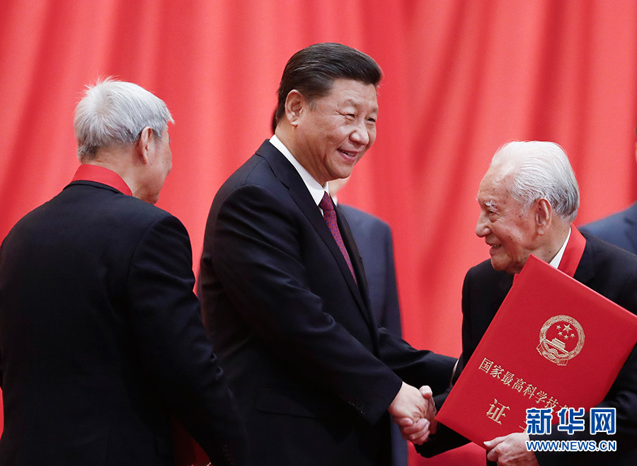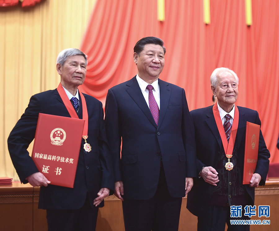 上午10時30分,大會在雄壯的國歌聲中開始。在熱烈的掌聲中,中共中央總書記、國家主席、中央軍委主席習近平首先向獲得2019年度國家最高科學技術(shù)獎的原中國船舶重工集團公司第七一九研究所黃旭華院士和中國科學院大氣物理研究所曾慶存院士頒發(fā)獎章、證書,同他們熱情握手表示祝賀,并請他們到主席臺就座。隨后,習近平等黨和國家領(lǐng)導人同兩位最高獎獲得者一道,為獲得國家自然科學獎、國家技術(shù)發(fā)明獎、國家科學技術(shù)進步獎和中華人民共和國國際科學技術(shù)合作獎的代表頒發(fā)證書。