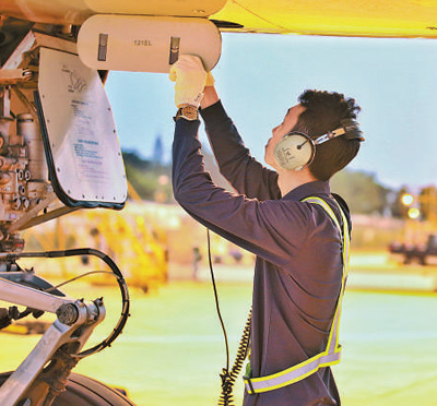 10日,機務人員進行起飛前的各項檢查。當日,海口美蘭機場飛往北京大興機場的首個航班順利起航。朱榮鵬 紀巧珠攝影報道(影像中國)