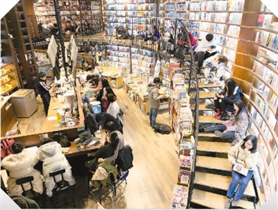 放眼望去,燈火通明的書店在深夜里依然座無虛席。有人緩緩踱步,不時翻翻看看;有人啜著咖啡,面對電腦手指翻飛。記者沿著樓梯拾級而上,發(fā)現(xiàn)還有一些顧客或坐或臥,或淺聲交談,或?qū)P拈喿x。