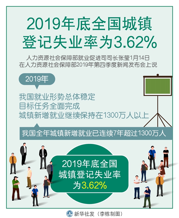新華社北京1月14日電(記者王優(yōu)玲)人力資源社會保障部就業(yè)促進司司長張瑩14日說,2019年我國就業(yè)形勢總體穩(wěn)定,目標(biāo)任務(wù)全面完成,城鎮(zhèn)新增就業(yè)繼續(xù)保持在1300萬人以上,2019年底全國城鎮(zhèn)登記失業(yè)率為3.62%。