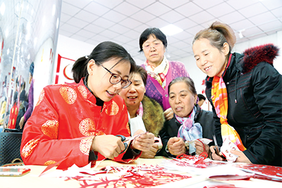 山東淄博市張店區開展“迎新春·情暖冬日”活動,組織機關干部教群眾剪窗花。