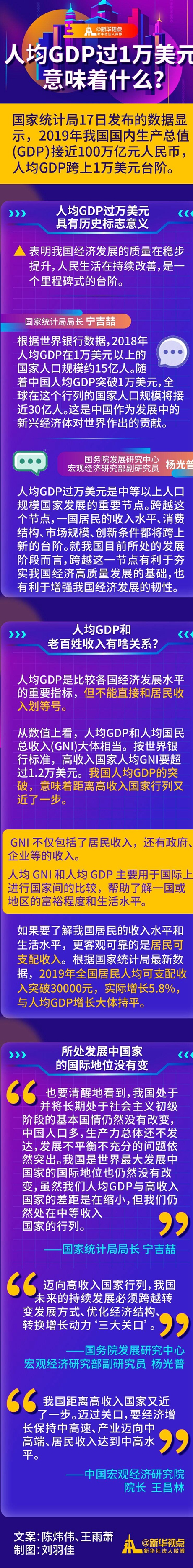 經(jīng)濟(jì)總量接近100萬億元、人均國內(nèi)生產(chǎn)總值突破1萬美元,國家統(tǒng)計(jì)局17日發(fā)布的2019年中國經(jīng)濟(jì)成績單,凸顯中國經(jīng)濟(jì)里程碑式的新跨越。