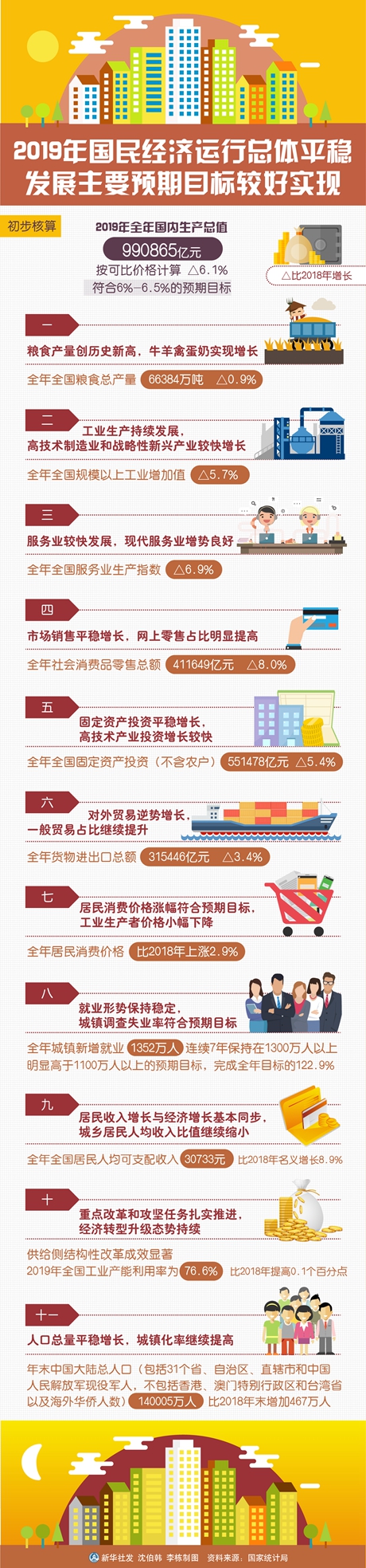 “國民經(jīng)濟(jì)運(yùn)行總體平穩(wěn)、穩(wěn)中有進(jìn),發(fā)展質(zhì)量穩(wěn)步提升,主要預(yù)期目標(biāo)較好實(shí)現(xiàn),為全面建成小康社會(huì)奠定堅(jiān)實(shí)基礎(chǔ)。”國家發(fā)展改革委副主任兼國家統(tǒng)計(jì)局局長寧吉喆評(píng)價(jià)說。
