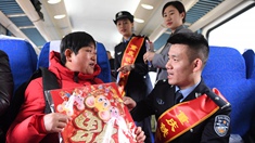 春節臨近,列車車窗上貼著窗花,車廂內張燈結彩。為了讓老鄉們快樂回家,貴州團省委組織的青年文藝志愿者與廣鐵集團廣州客運段動車2隊的乘務員們一起在車廂表演起豐富多彩的文藝節目。