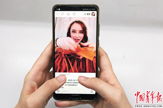 一位消費者在查看手機里關于網紅食品的視頻。中青報·中青網記者 李崢苨/攝