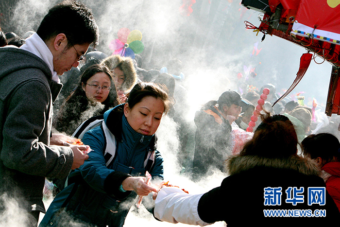 2008年2月6日,游客在北京地壇春節(jié)廟會上挑選風味小吃。(圖片來源:新華社 張迺杰攝)