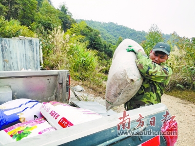 朱建聰正扛著一袋花生麩,花生麩用作茶山的堆肥。陳國飛 攝