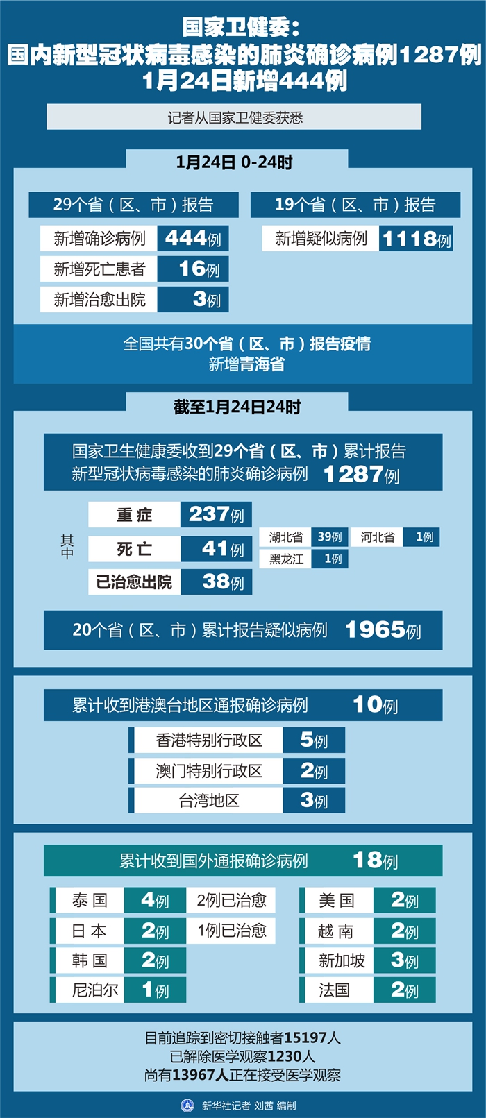 截至1月24日24時(shí),國家衛(wèi)健委收到29個(gè)省(區(qū)、市)累計(jì)報(bào)告新型冠狀病毒感染的肺炎確診病例1287例,其中重癥237例,死亡41例(湖北省39例、河北省1例、黑龍江1例)。已治愈出院38例。20個(gè)省(區(qū)、市)累計(jì)報(bào)告疑似病例1965例。