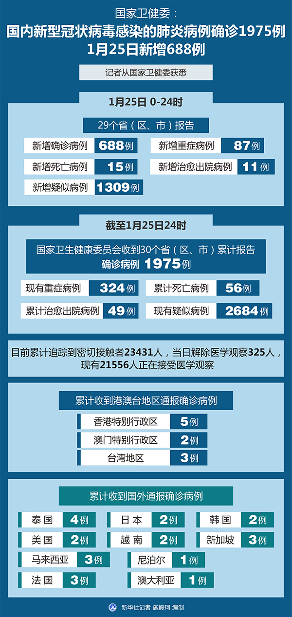 截至1月25日24時,國家衛(wèi)生健康委員會收到30個省(區(qū)、市)累計報告確診病例1975例,現(xiàn)有重癥病例324例。累計死亡病例56例,累計治愈出院病例49例。現(xiàn)有疑似病例2684例。