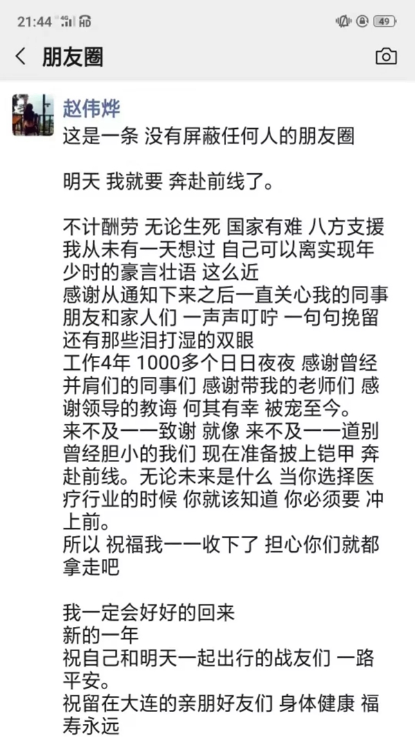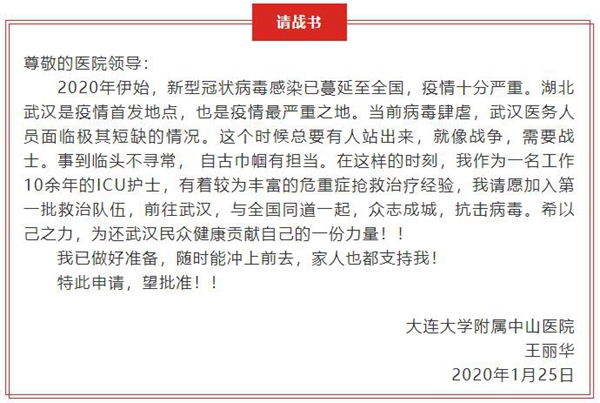通知下發(fā)后,大連各大醫(yī)院醫(yī)護人員紛紛主動請纓:“只要被需要,義無反顧,放心吧主任,我強壯”“主任,我也可以去武漢,等待您的派遣”“一切聽從組織安排”“需要我們的時候到了,沒有硝煙的戰(zhàn)場需要我們,我自愿加入抗擊疫情的隊伍”……醫(yī)院微信群里被自愿報名聲刷屏。